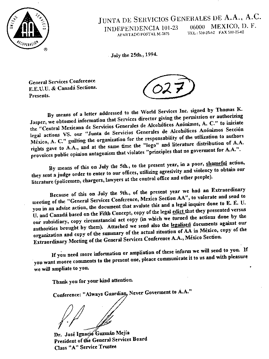 July 25, 1994 letter from Dr. Jose Ignacio Guzman Mejia, Chairman of Section Mexico General Service Board, to the General Service Conference US/Canada