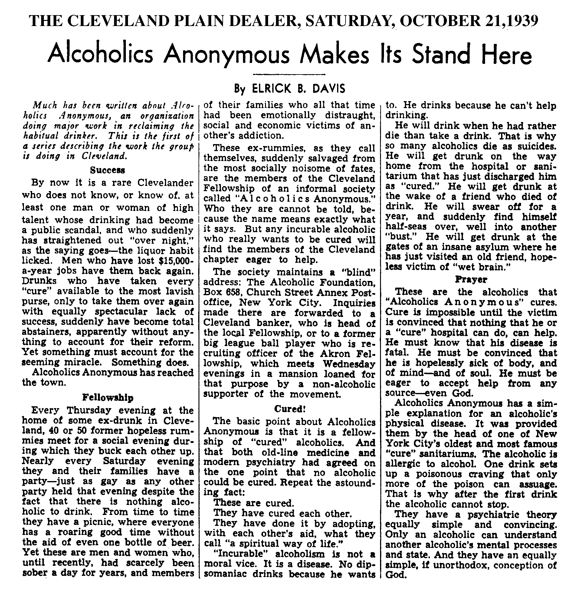 Interestingly, this very same magazine would publish an article about Alcoholics Anonymous just over four years later, on March 1, 1941. That article would be the start for many more thousands of alcoholics to begin their journey on the road to sobriety. That national publicity would catapult Alcoholics Anonymous toward of what it has become today.