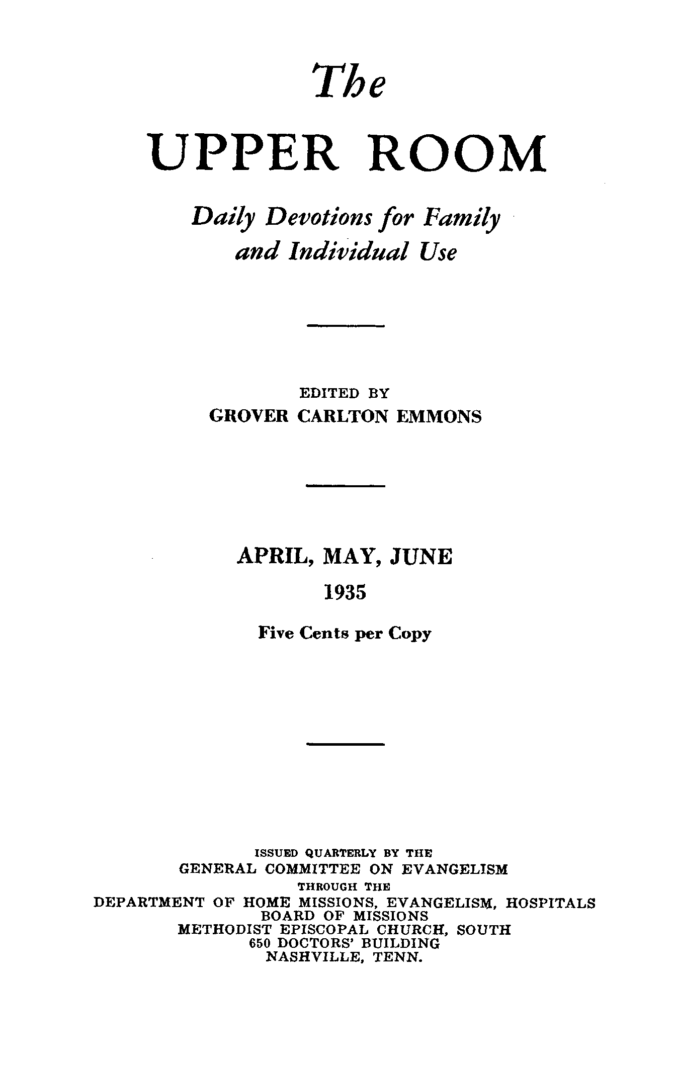 In the Oxford Group, Guidance was by the Holy Spirit and was received through "two-way" prayer. There was a prayer to God for Guidance and then listening for leading thoughts from God. The person who, through "Guidance," was chosen to lead the meeting would pray for God to "Guide" him or her as to what he should read or say at the meeting. Then there would be "quiet time" spent silently listening for, and then, to God's response. The Group would then read from a Bible devotional - usually THE UPPER ROOM. This was a publication of the Methodist Church South out of Nashville, Tennessee.