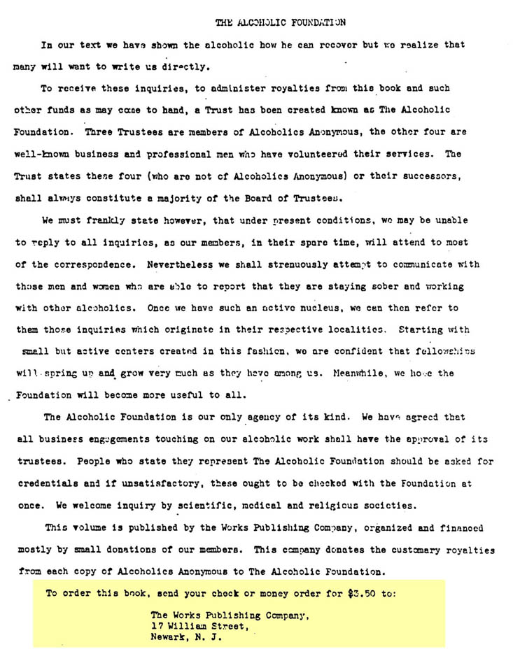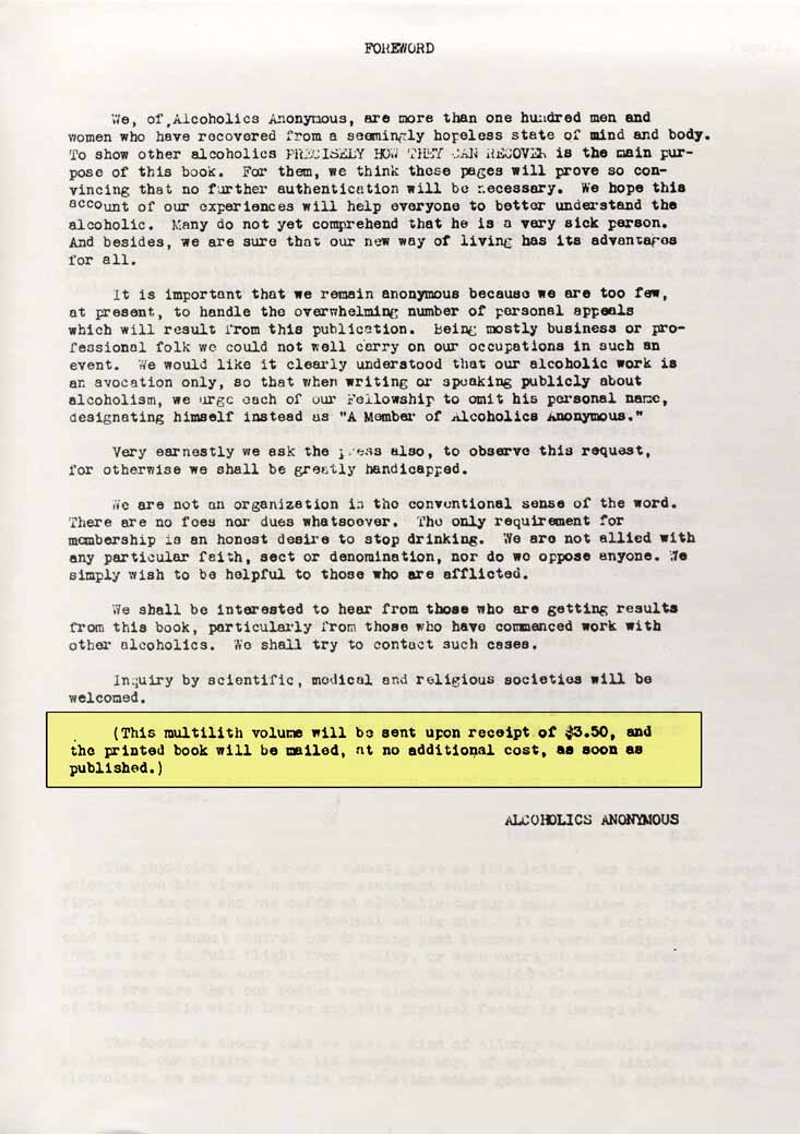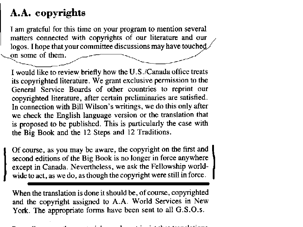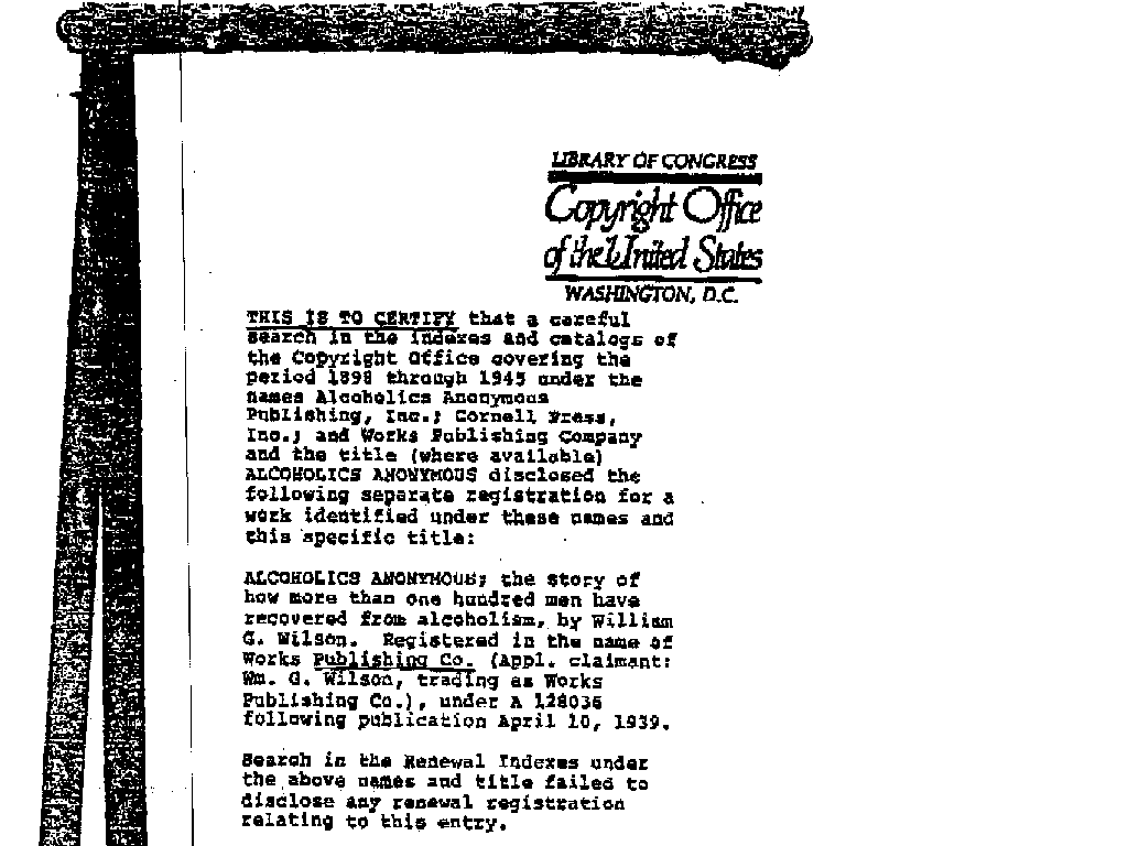 The Original Manuscript (pre-publication, multilith draft) of the Big Book was published and sold for $3.50 in January 1939 and later without any copyright notice and without copyright registration. It was mandatory to have such notice on each and every copy of the book. Even a stamp "loan copy" could not legally replace the requested copyright notice. GSO archives NYC sell photocopies of this pre-publication for $12 since 1978. Non of them has a copyright notice on it.