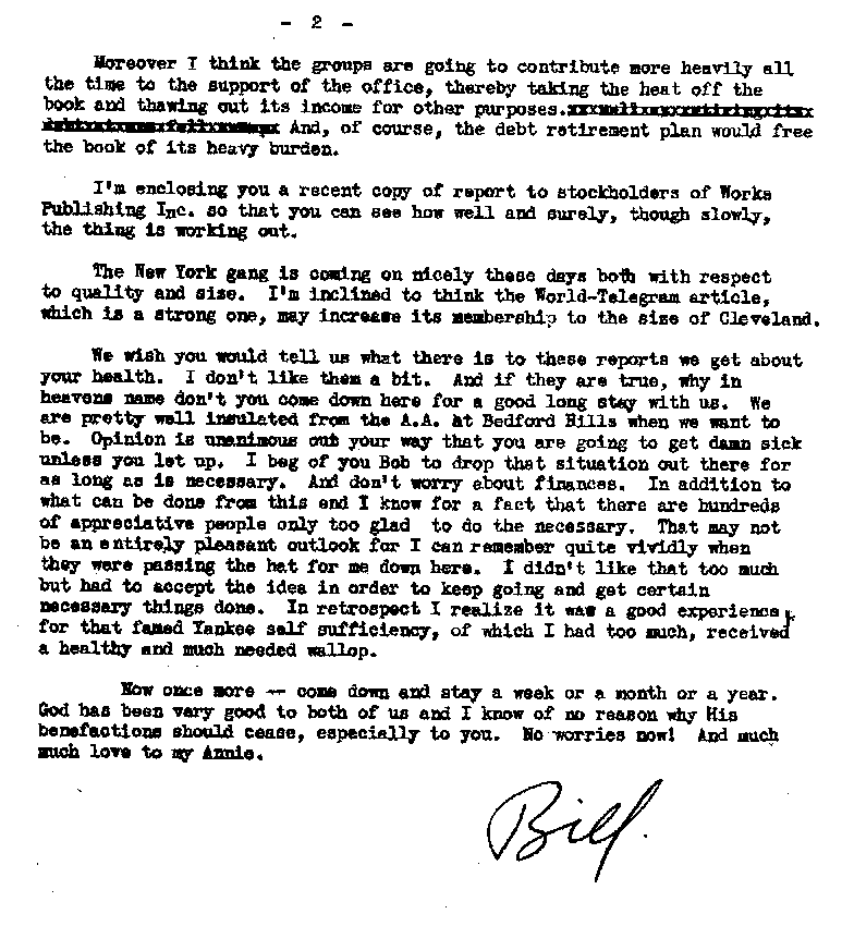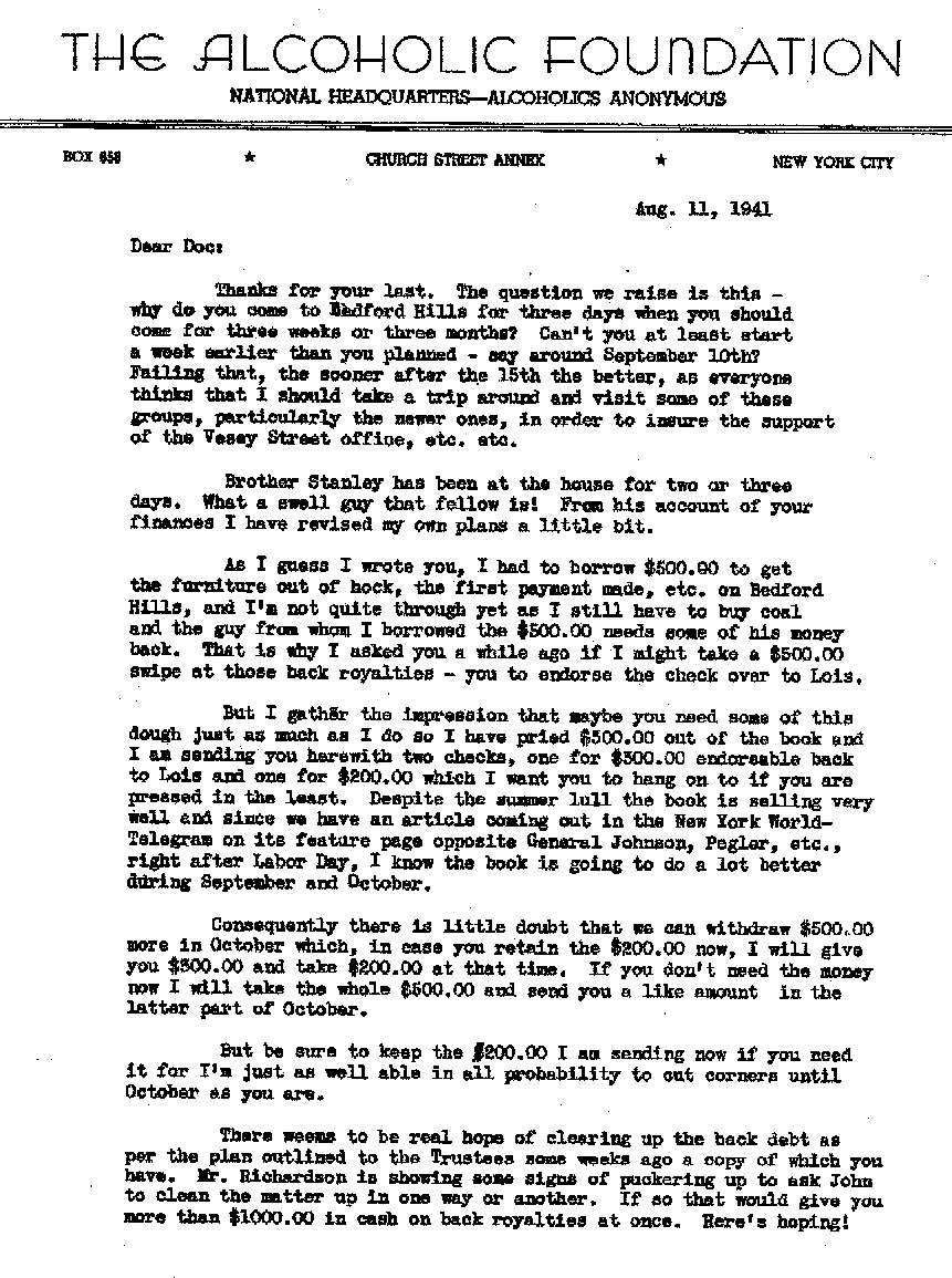 On Alcoholic Foundation letterhead --though he wasn't a member-- Bill tries to sneak out $500 from Bob's royalties on the Big Book, because Bill is not entitled to receive any.