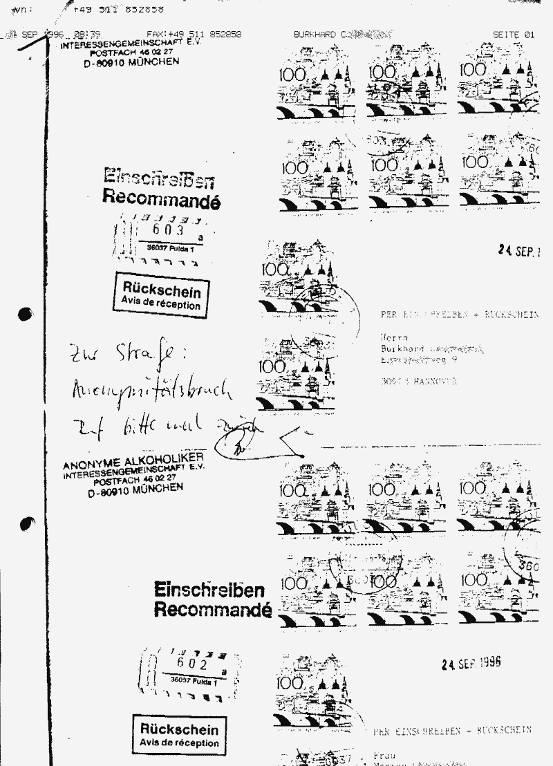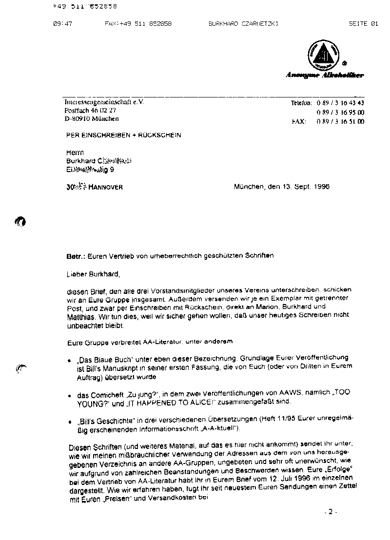 | From: AA Inc., Germany, Munich September 13, 1996 certified mail - return receipt To: all members of AA Big Book Study Group Subject: Your Distribution of copyrighted literature Beloved Burkhard [sic], This letter signed by the all three members of the AA GSB is directed to your group as a whole. Moreover, we send one extra copy to Marion, Burkhard and Matthew by certified mail return receipt. We do so, because we want to make sure today's letter will not be ignored. Your group distributes AA literature, for example