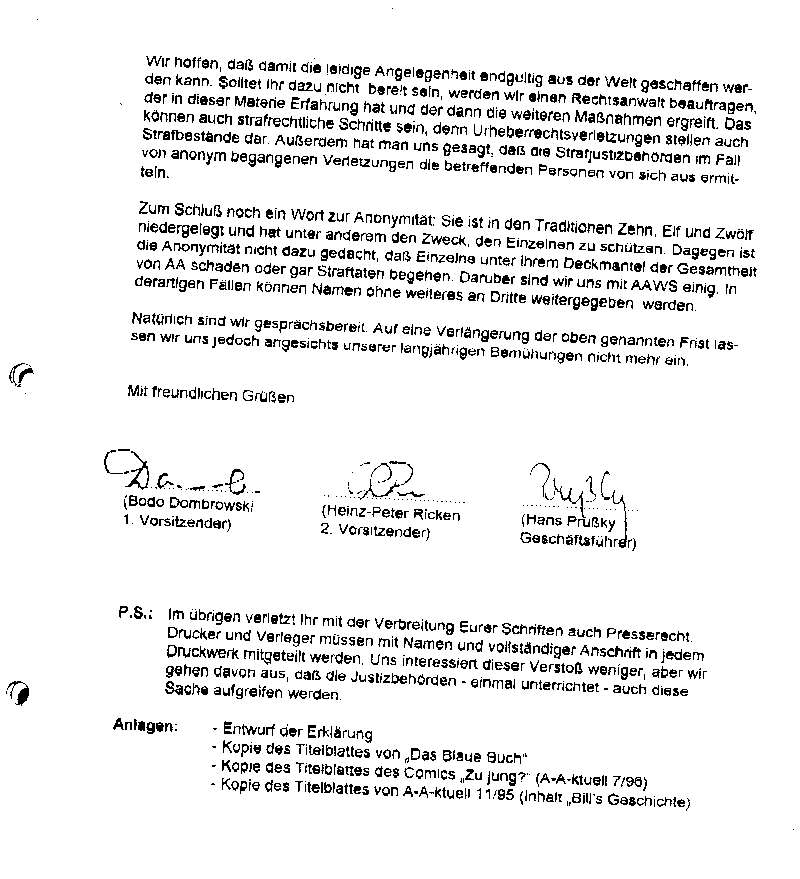 We hope that this ugly matter can be thereby settled forever. Should you not be ready for that, we will get us an attorney who is experienced in the matter, and who will take further action. This may include criminal charges [3] (see footnote) because copyright violations are a crime. Moreover, we were told that if certain crimes were committed by anonymous persons then these persons are investigated and uncovered [4] (see footnote) by the Department of Justice and its legal arms directly. In finishing this letter something about anonymity: It is set down in the Traditions Ten, Eleven and Twelve and among other things, has the purpose to protect the individual. Despite that, anonymity is not meant to be a shield for individuals to do harm to AA as a whole, or even to commit crimes. We are in perfect unity with AAWS about this point of view. Under such circumstances, names can be given away to anyone without restrictions. [5] (see footnote) Of course, we are ready to talk. But, a postponement of our ultimatum is impossible because we have already tried for years. [6] (see footnote) Very truly yours, Mr. Bodo Dombrowski Heinz-Peter Ricken Hans Prussky Exhibits