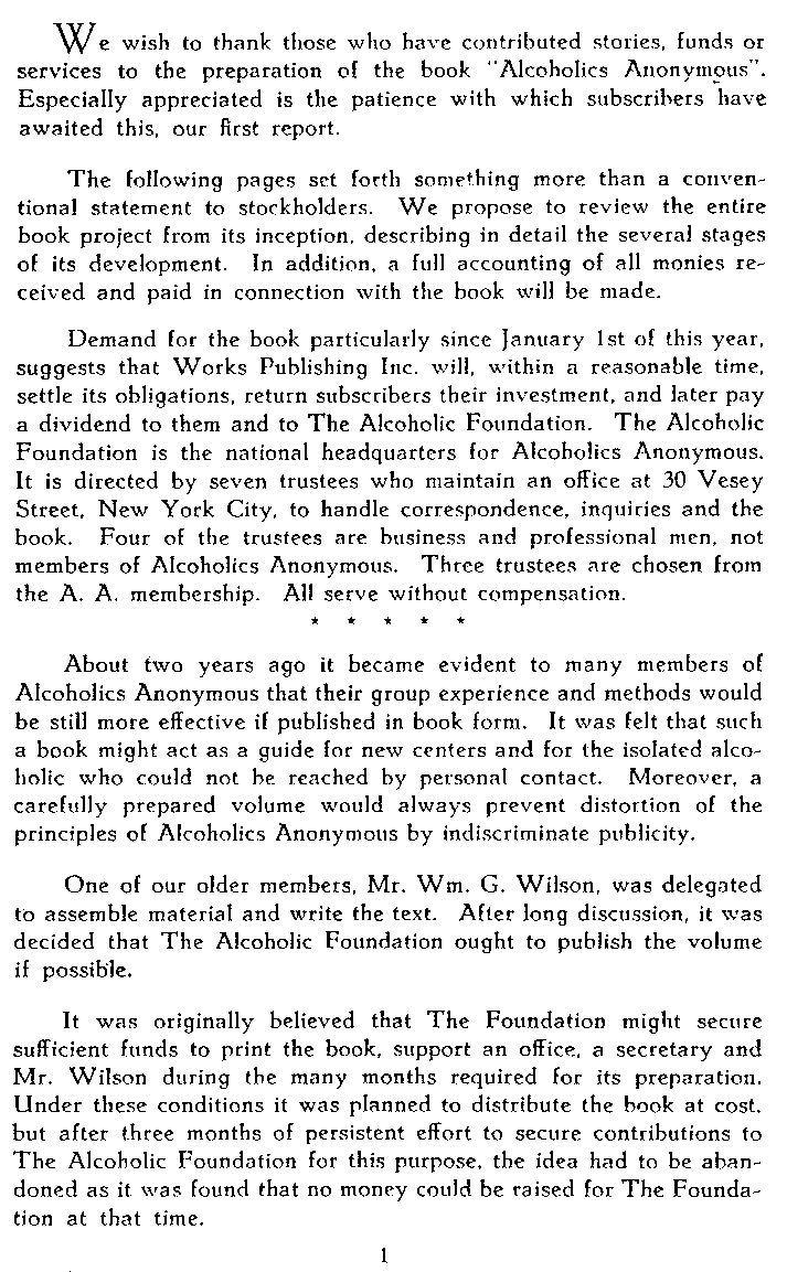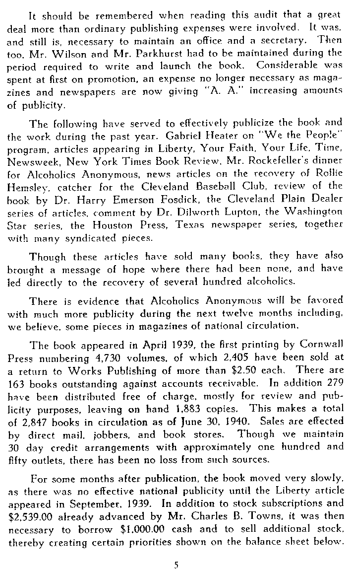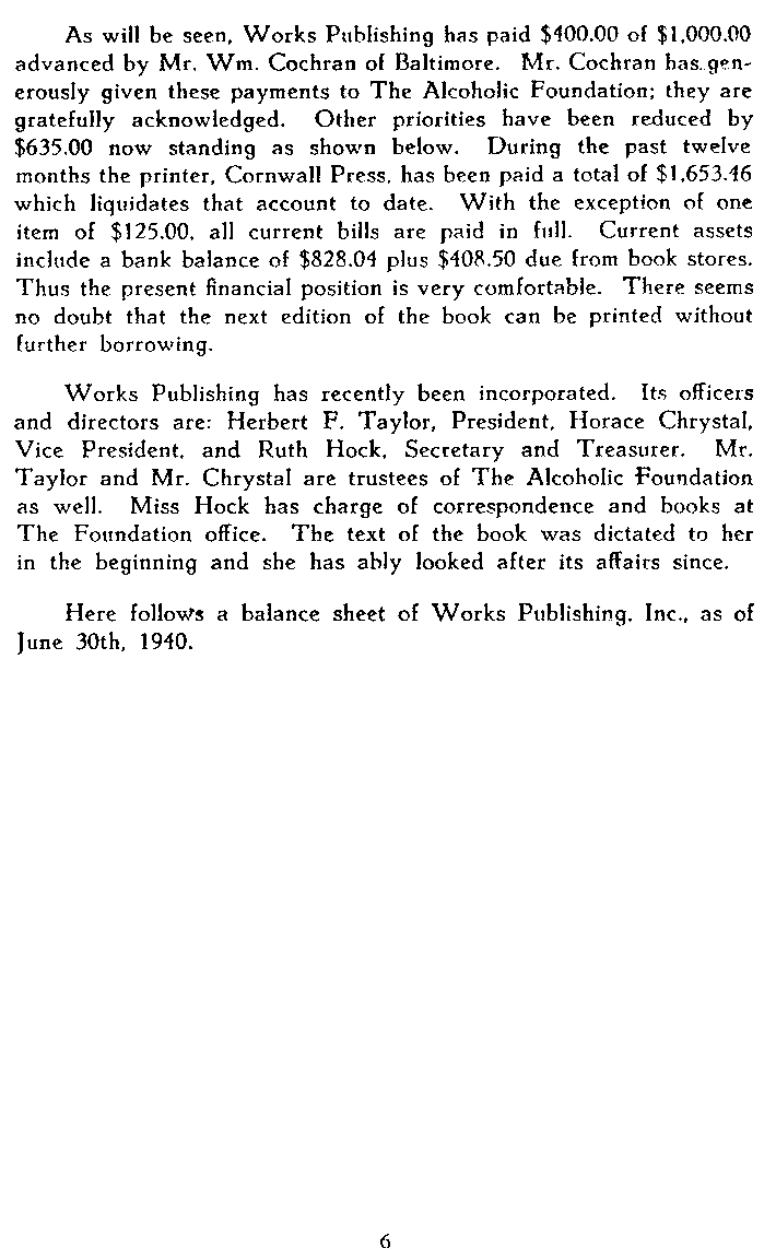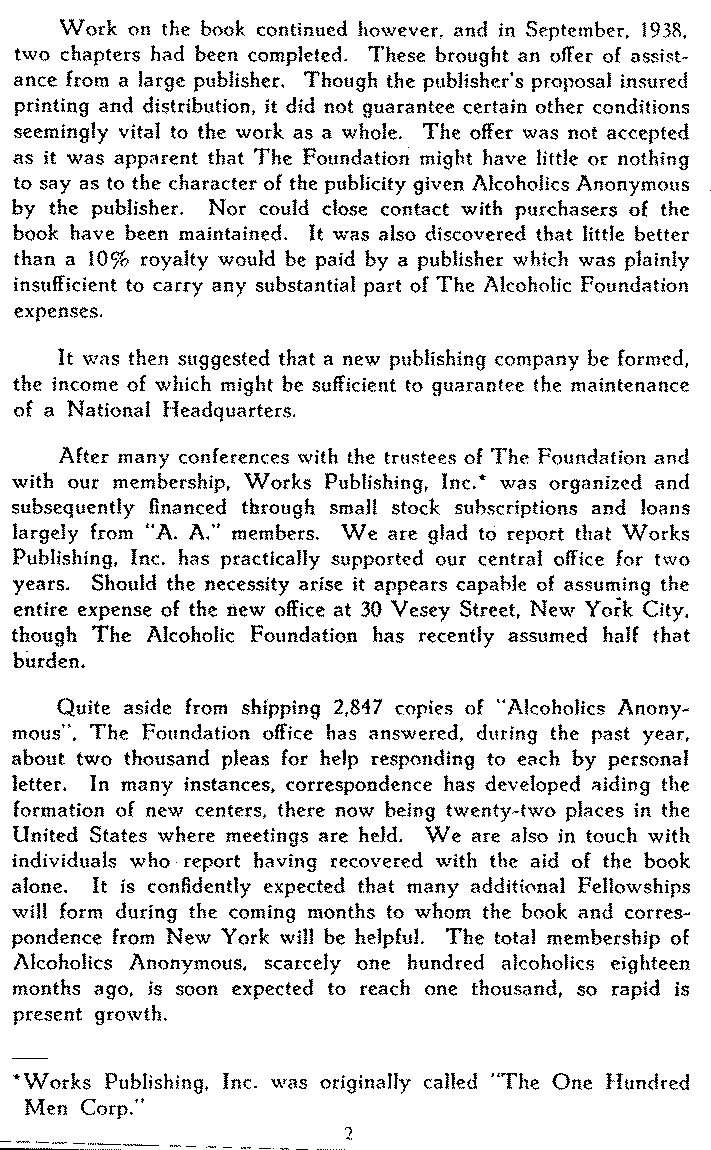 Works Publishing Inc.was founded June 20th, 1940. Herbert Taylor was President and Horace Crystal was Vice-President. Bill Wilson was not involved for a reason. He had privately eaten up thousands of dollars stock subsriber cash plus Charles B. Towns donations and other monies. When the book was printed, but not paid, the police came after him, because he had also taken the money for Cornwall Press Inc. and not paid because he had tried to take the book for himself alone. ![]() The Rockefeller Dinner took place Feb 8, 1940.
